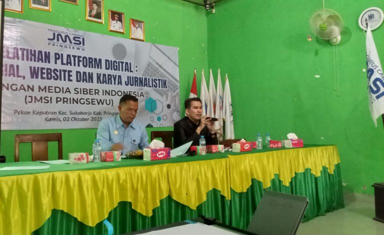 PRINGSEWU TV – Sukoharjo | Jaringan Media Siber Indonesia (JMSI) Kabupaten Pringsewu menggelar Pelatihan Platform Digital yang mencakup materi pemanfaatan media sosial, pengelolaan website, dan pengembangan karya jurnalistik. Kegiatan berlangsung di Aula Pekon Kaputren, Kecamatan Sukoharjo, Kabupaten Pringsewu, pada Kamis (2/9/2025).